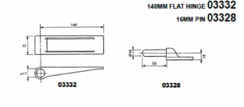 | 03332/03328 | 140mm long hinge flat & 16mm heavy pin kit | 140 & 16mm | 10x17mm long hinge, 17mm ID hole, 10x16mm heavy pin mount | Call |